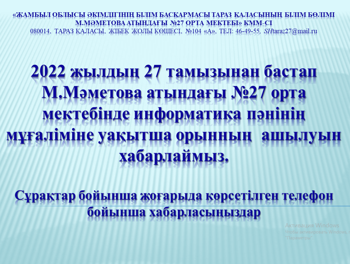2022-2023 оқу жылына төмендегі бос орын бар: информатика пәнінің мұғалімі (екі тілде), 1 жүктеме (18,5 сағат), уақытша орын.