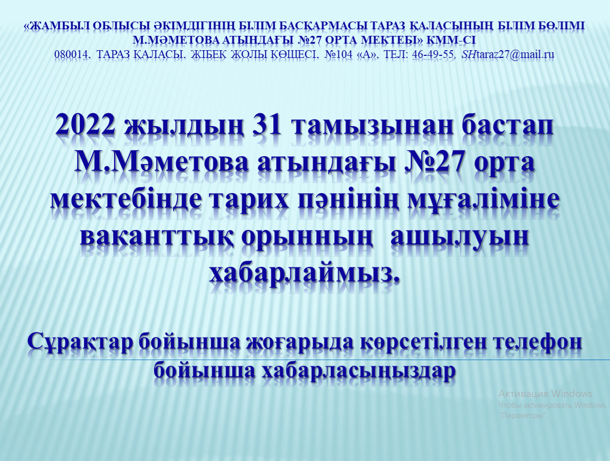 М.Мәметова атындағы №27 орта мектебі 2022-2023 оқу жылына конкурстық негізде педагогтерді жұмысқа қабылдауды ағымдағы жылдың 31 тамызынан өтеді.