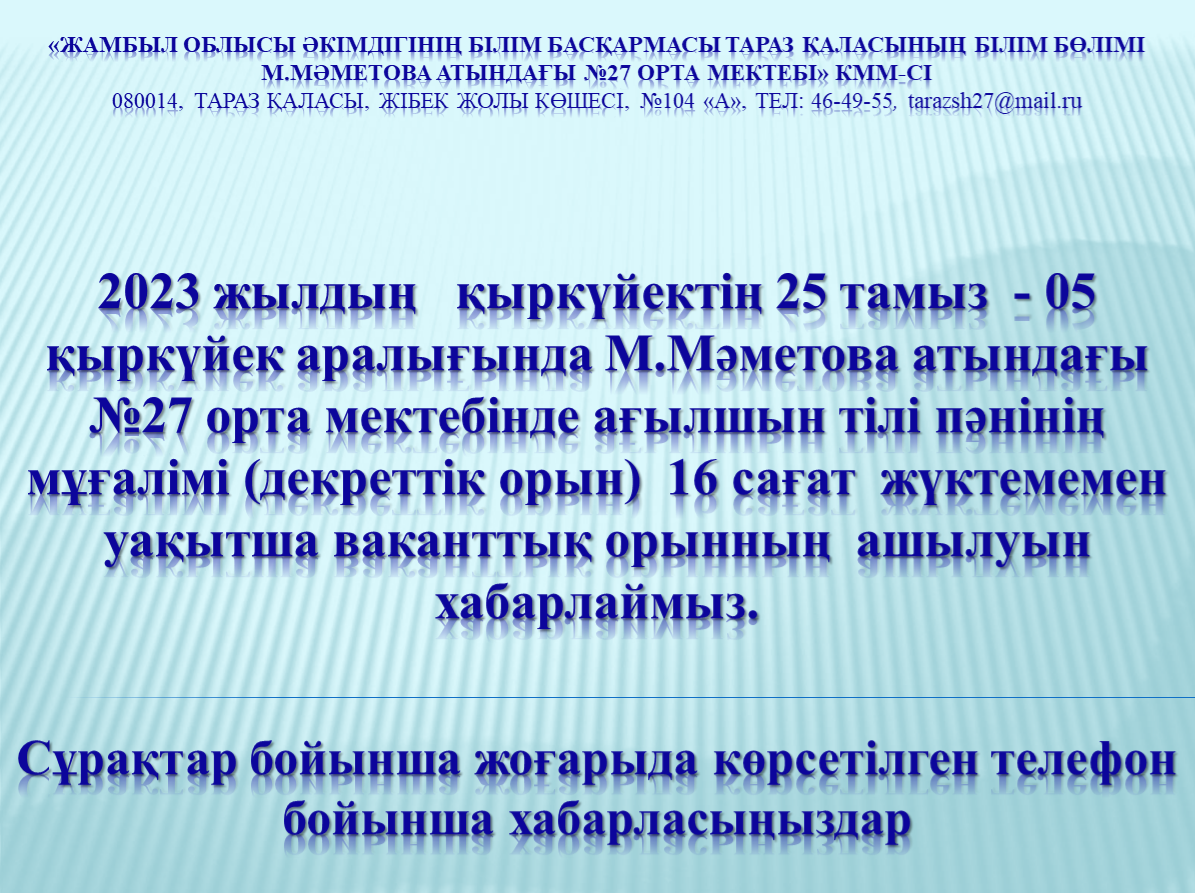 ü Бос жұмыс орындары туралы хабарландырулар 27-taraz.mektebi.kz мектебіміздің ресми сайтына жарияланады.