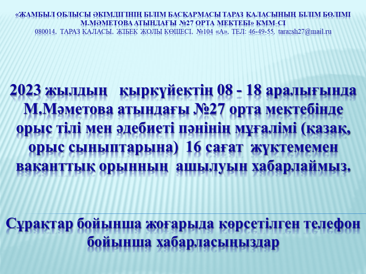 ü Бос жұмыс орындары туралы хабарландырулар 27-taraz.mektebi.kz мектебіміздің ресми сайтына жарияланады.
