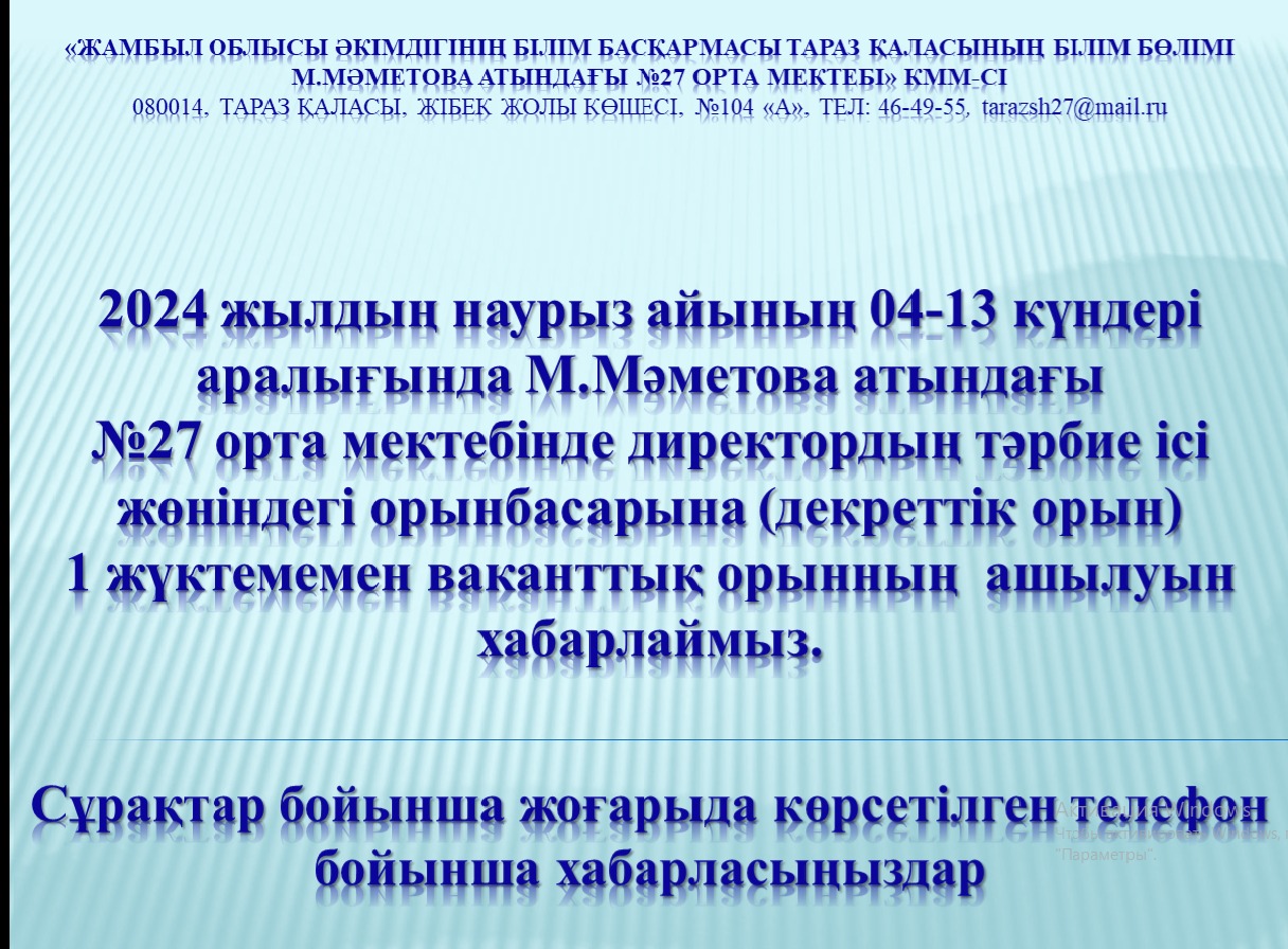 ü Бос жұмыс орындары туралы хабарландырулар 27-taraz.mektebi.kz мектебіміздің ресми сайтына жарияланады.