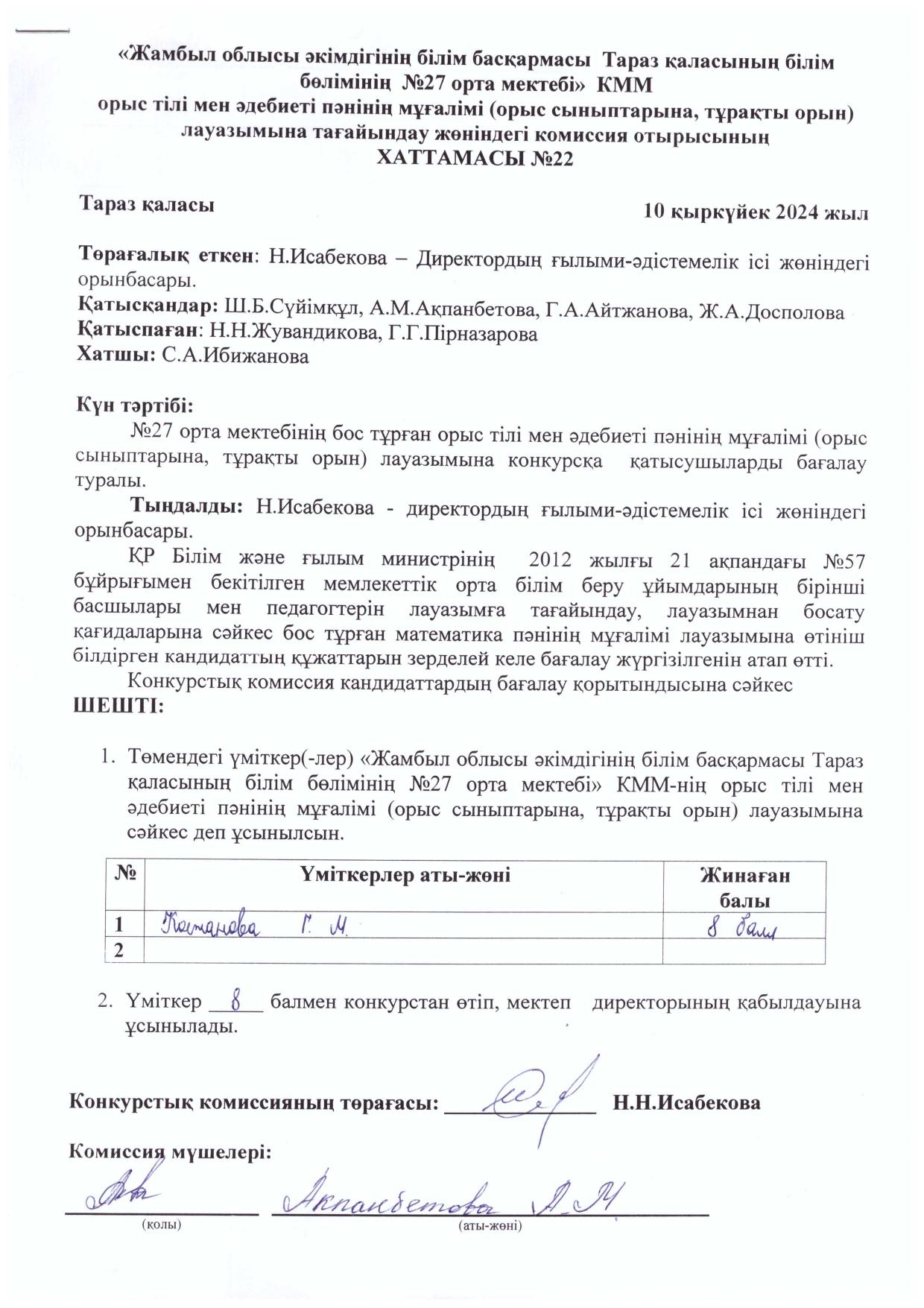 Педагог лауазымына қабылдау конкурсының хаттамасы » СШ №27