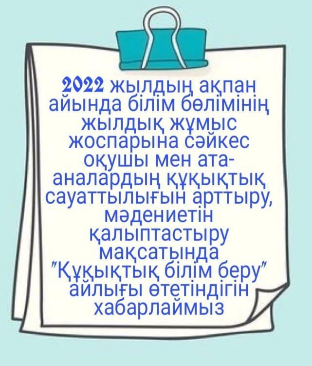 01 ақпан 2022 0 1 2 3 4 5 Құқықтық білім беру айлығы 2022 жылдың ақпан айында білім бөлімінің жылдық жұмыс жоспарына сәйкес оқушы мен ата- аналардың құқықтық сауаттылығын арттыру, мәдениетін қалыптастыру мақсатында "Құқықтық білім беру" айлығы өтетіндігін хабарлаймыз Осы беттің QR-коды:QR-код этой страницы: