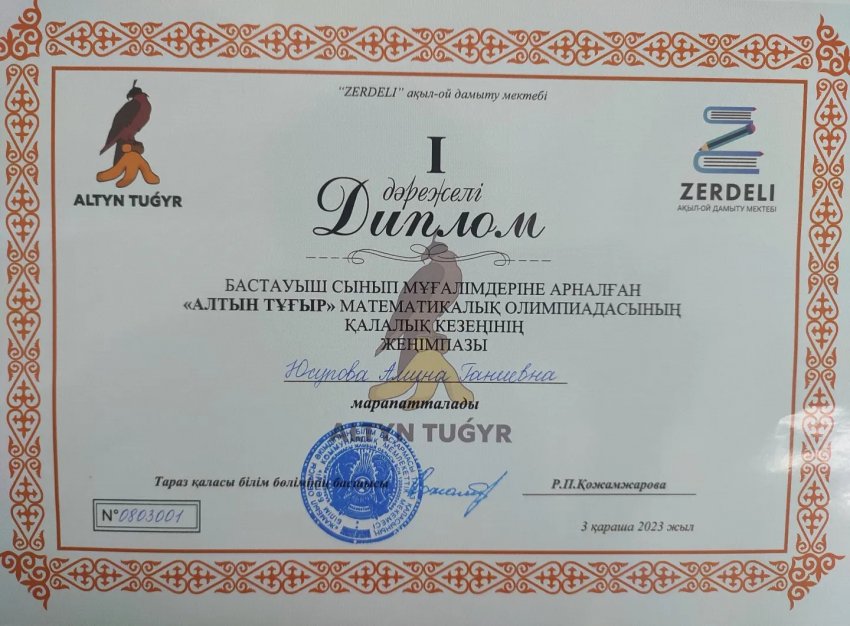 23 қараша 2023 0 1 2 3 4 5 "Алтын тұғыр" математикалық олимпиадасының қалалық кезеңінің жеңімпазы!!! Бастауыш сынып мұғалімдеріне арналған "Алтын тұғыр" математикалық олимпиадасының қалалық кезеңінен І орын иеленіп жеңімпаз болған Юсупова Амина Ганиевнаны құттықтаймыз!!!Редактировать Осы беттің QR-коды:QR-код этой страницы: