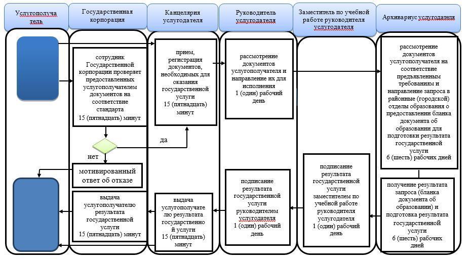 4) получение результата запроса (бланка документа об образовании) и подготовка результата государственной услуги – 6 (шесть) рабочих дней;