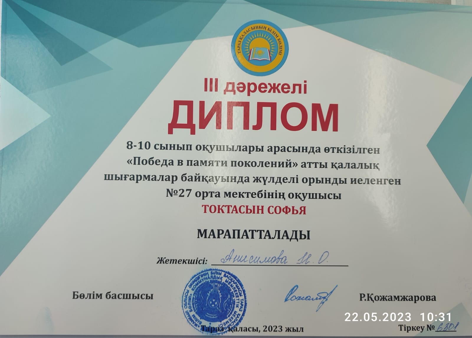 8-10 сынып оқушылары арасында өткен "Победа в памяти поколений" атты қалалық шығармалар байқауының жеңімпаздары